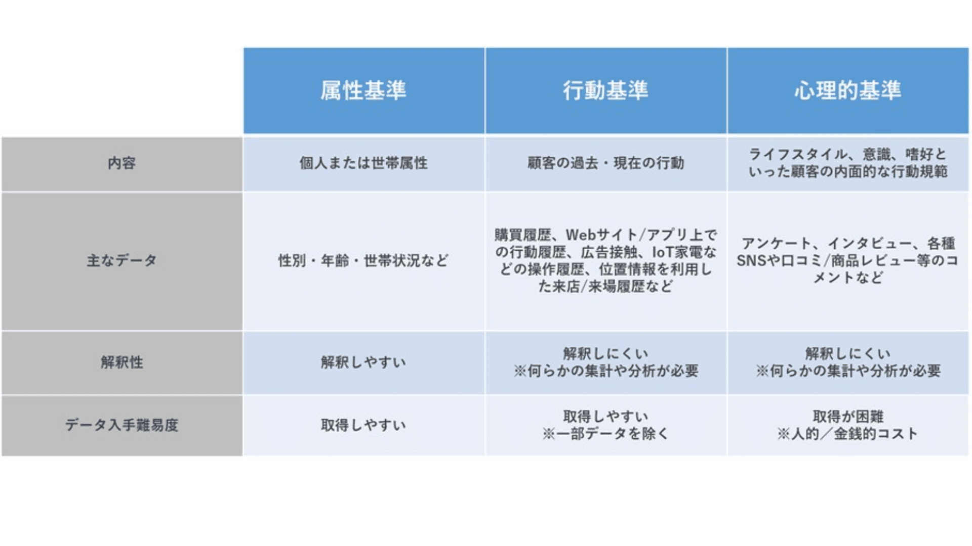 顧客のセグメントをどのように作るかについてはさまざまな基準が考えられますが、データ入手可能性の観点から、セグメンテーションの基準は大まかに以下にまとめることができます。