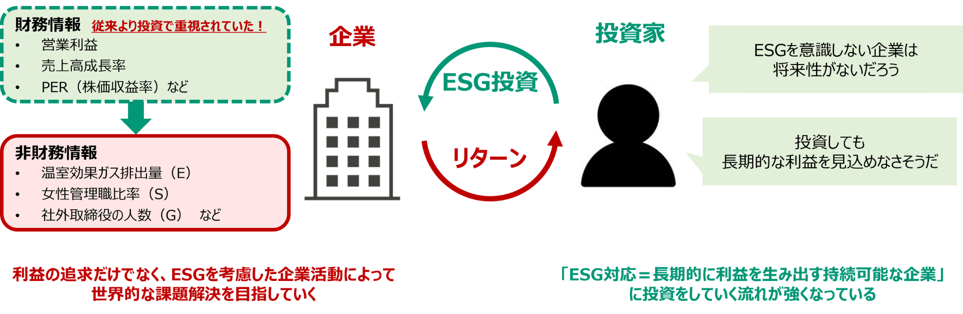 従来は営業利益などの財務情報が重視されていましたが、環境への配慮や従業員の安全管理やガバナンスの体制も投資の重要な要素になっています。