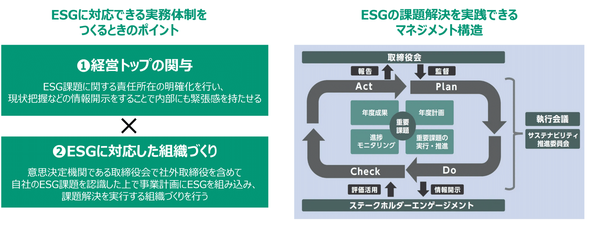 熱意を持ったESG経営の行う企業になるためには、経営トップの積極的関与は必要。ESG課題に関する責任所在を明確化し、社内の推進を後押しします。さらに必要に応じた組織づくりを行い、ESG課題解決を実践するマネジメント構造を確立させることも大事です。