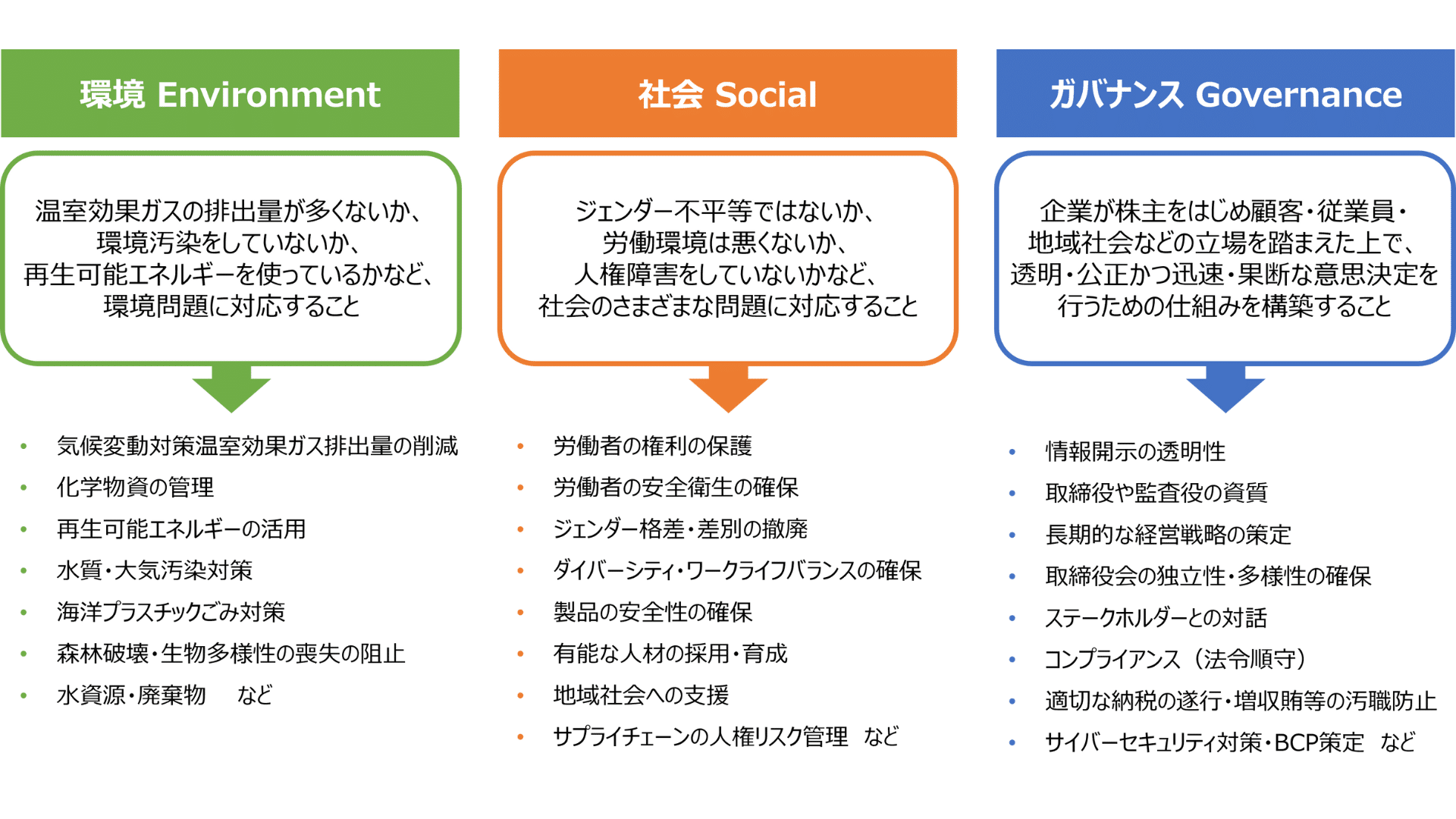 ガバナンスは、企業が株主をはじめ顧客・従業員・地域社会などの立場を踏まえた上で、透明・公正かつ迅速・果断な意思決定を行うための仕組みを構築することを指します。企業が長期的に成長するには、この3つの視点を考慮することが大事だという考え方が世界中で広がっています。