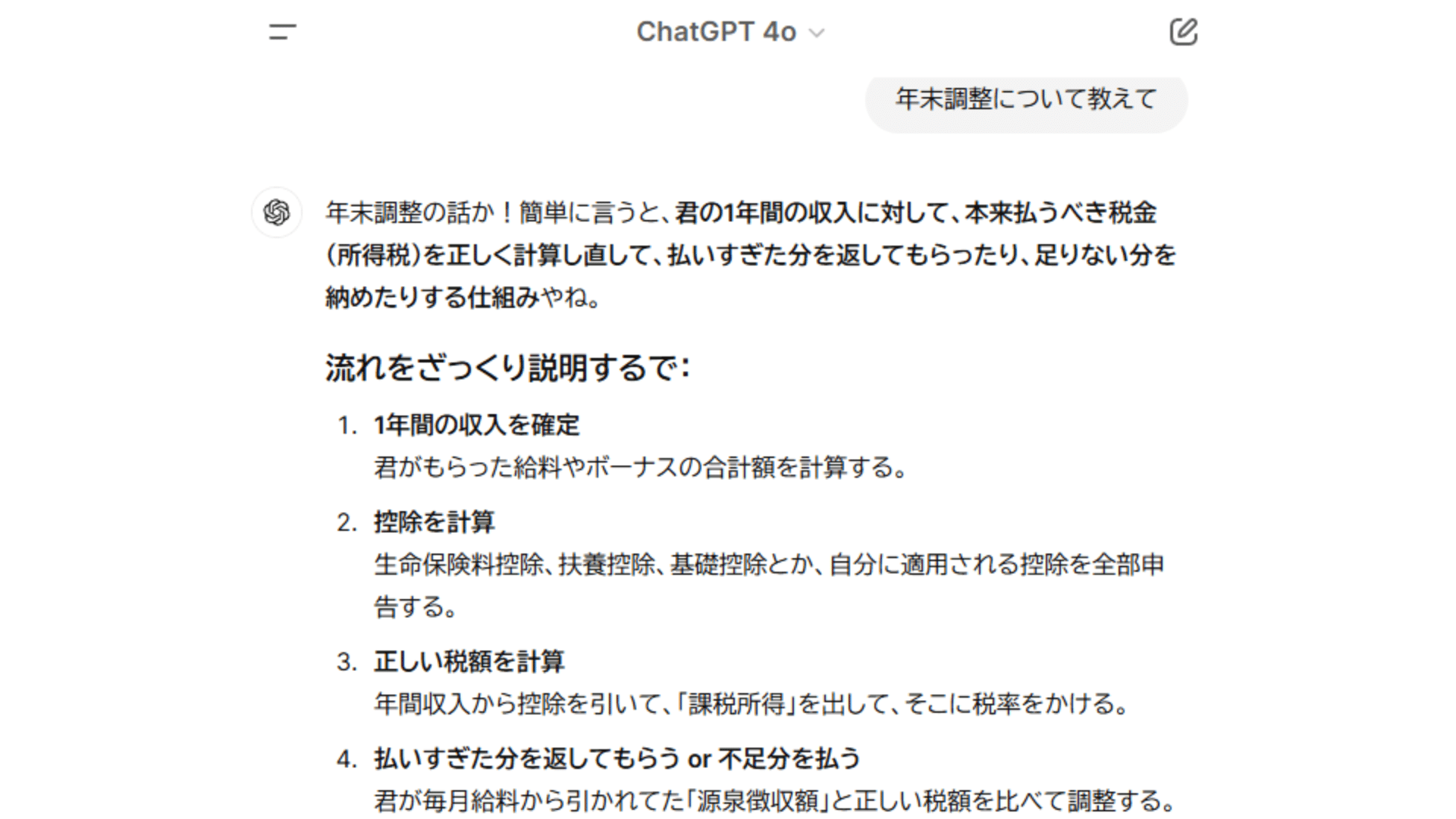 例えばChatGPT-4oに、「年末調整について教えて」とプロンプトを書くと、下記のような回答が返ってきました。