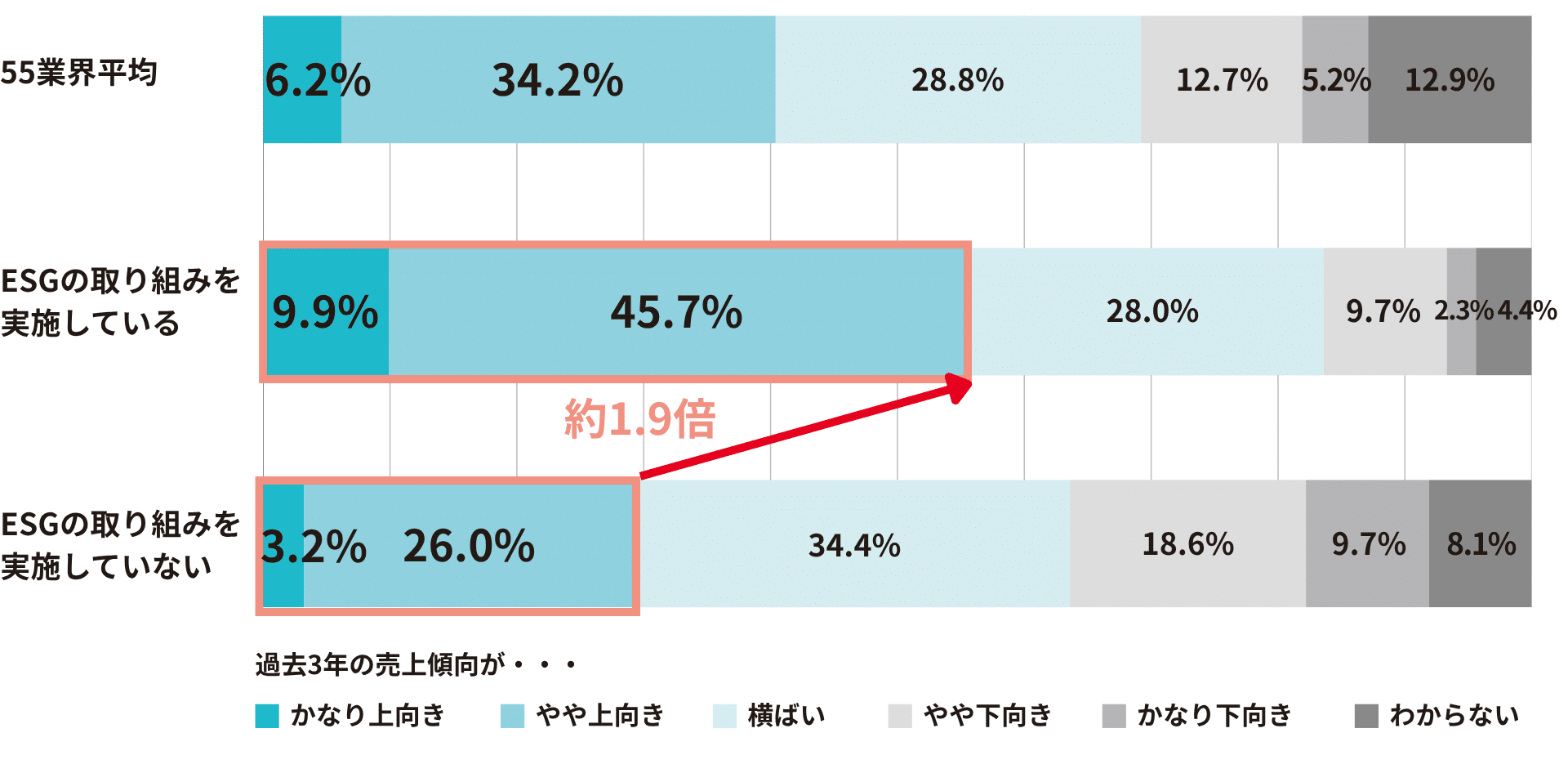 ESGの取り組みと過去3年程度の業績傾向との関係性を見てみると、ESGの取り組みを実施していない企業と比べて「売上高 上向き:約1.9倍」「売上総利益率上向き:2.1倍」「営業利益率上向き:2.0倍」高い傾向が見られました。ESGの取り組みを実施することは、企業の業績アップに貢献できると言えます。