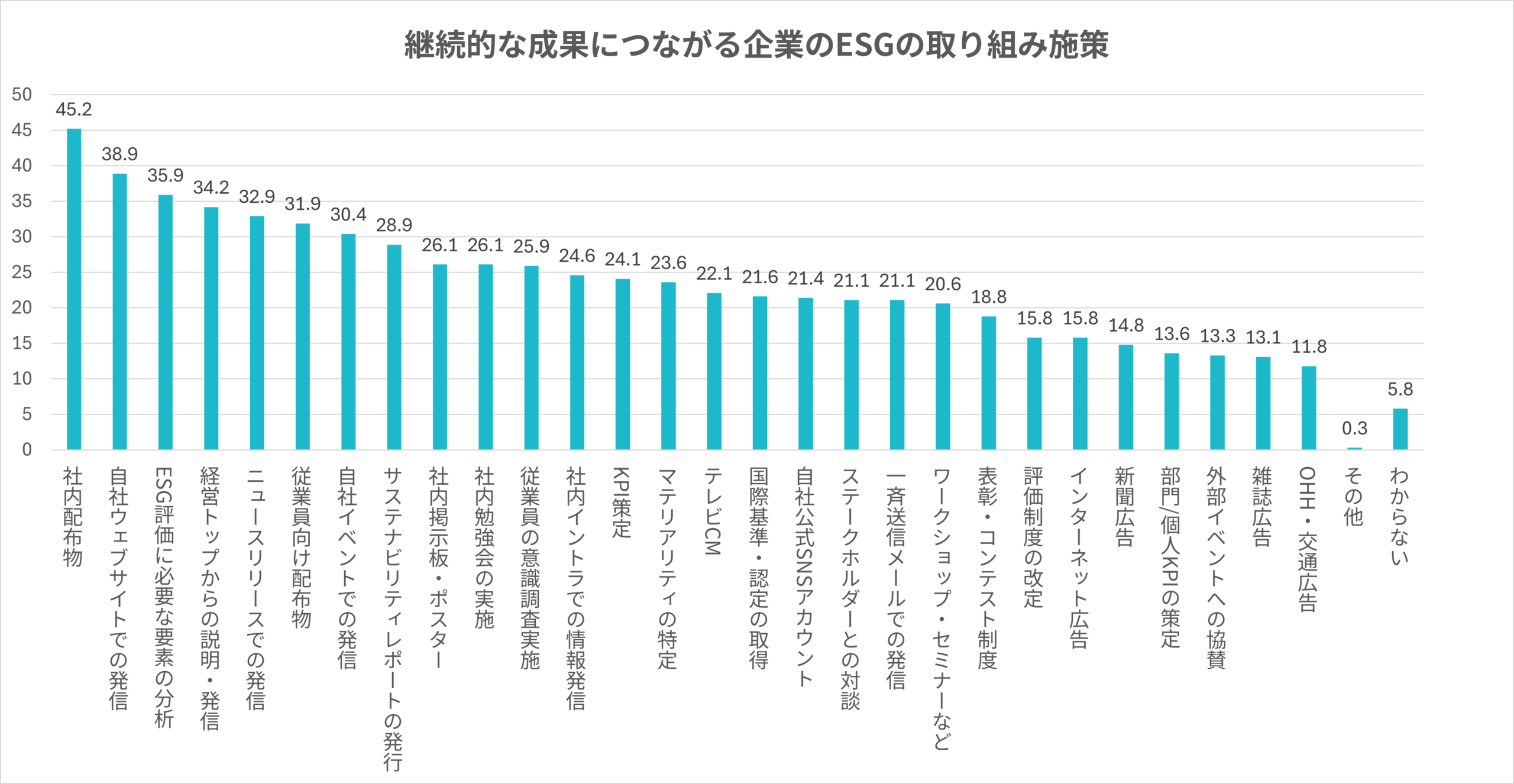 「社内配布物での取り組み発信」「自社ウェブサイトでの発信」「経営トップからの説明・発信」など社内浸透の施策が上位に挙がっています。まずは、社内に浸透させることで、従業員を巻き込むことが継続的な成果につながるのではないでしょうか。