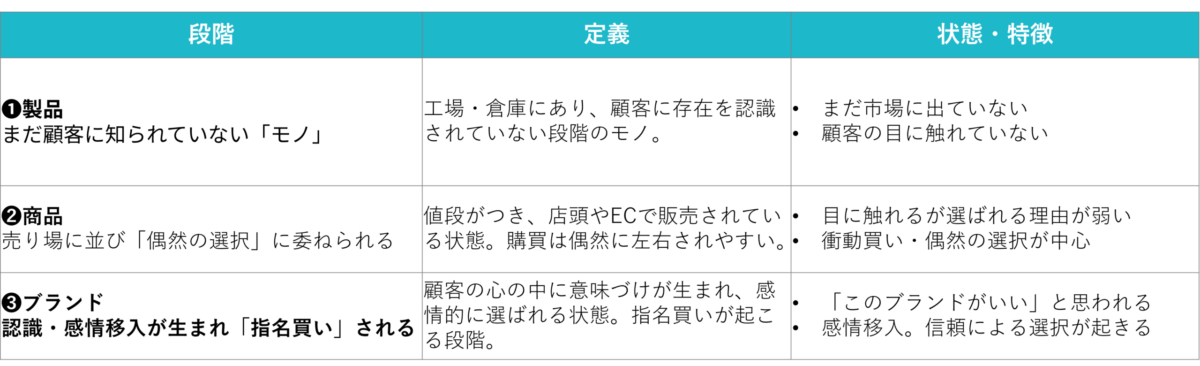 なのです。「製品 → 商品 → ブランド」の3段階をどう進化させるかが、ブランド戦略・ブランディングの出発点になります。