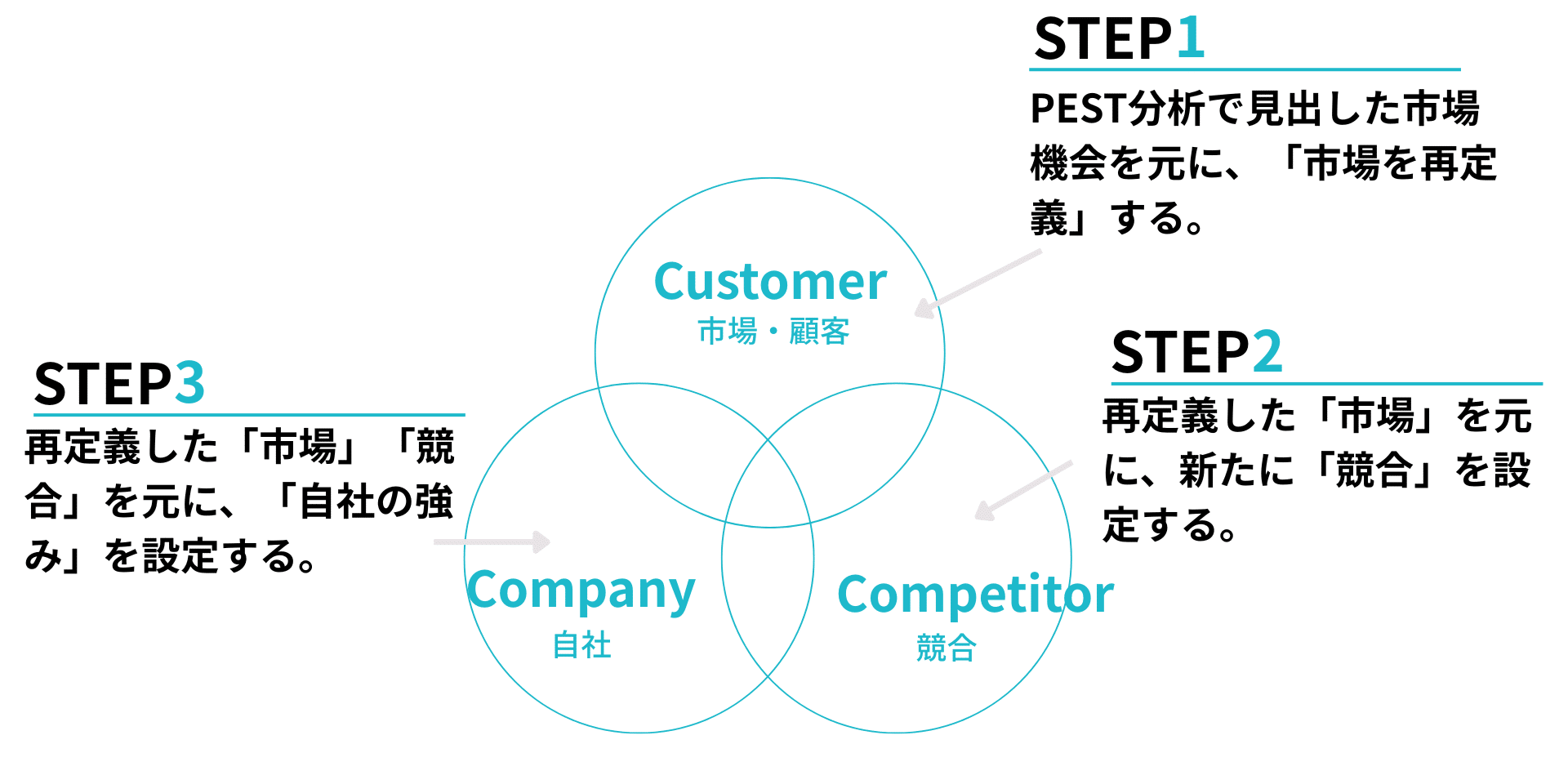 それは、次の3つの視点から自社の立ち位置を構造的に理解し直す マーケティング分析フレームワーク です。