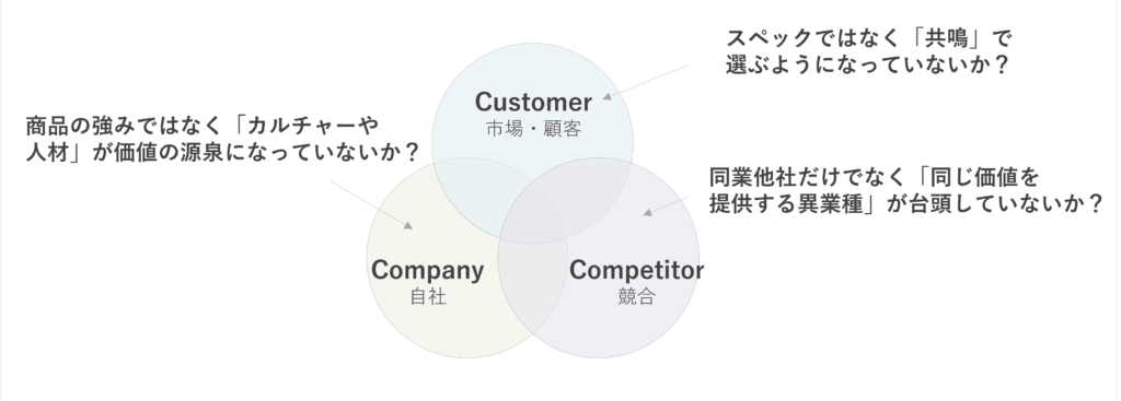 という“戦う構造そのもの”を、3C分析というフレームワークを使って定期的にアップデートする必要があります。