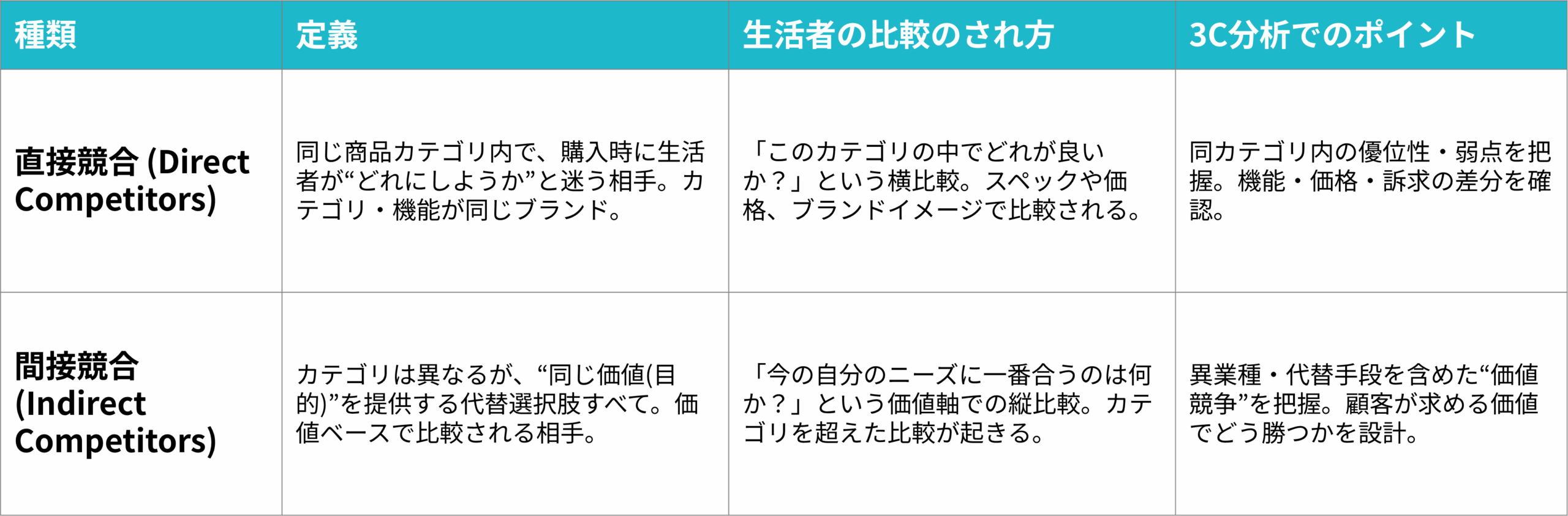競合には「直接競合」だけでなく、「間接競合」「価値競合」も含まれます。