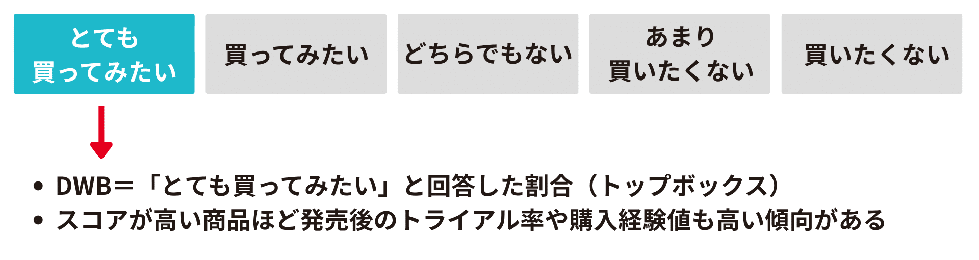 「とても買ってみたい」「買ってみたい」など5段階評価で購入意向を測定する方法です。店頭消費財の場合、DWBのスコアは初年度のトライアル購入率と高い相関を示すとされます。