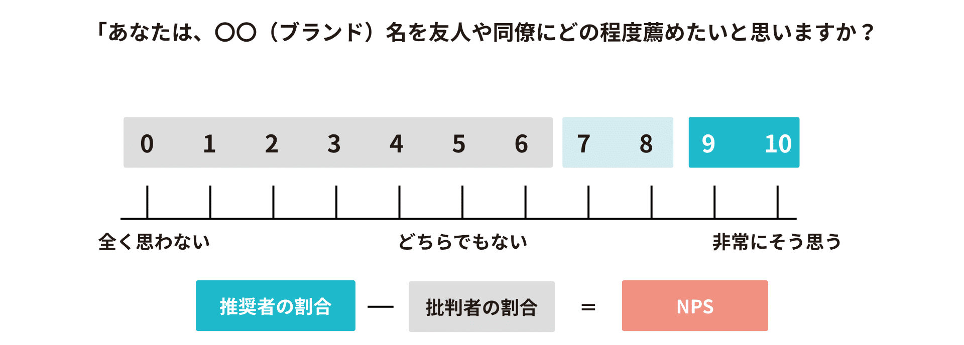 「あなたはこのブランドを友人や同僚に勧めたいですか?」という質問に0〜10点で回答してもらい、推奨者の割合から批判者の割合を引いたスコアです。ブランドへの愛着だけでなく推奨意欲も測れるため、ロイヤリティの総合指標として広く活用されています。