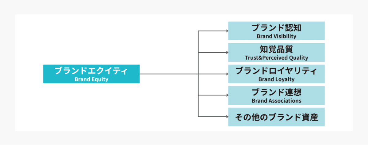 ブランドエクイティは、複数の要素が組み合わさって初めて成立します。アーカー教授は、その構成要素を次の5つに整理しています。