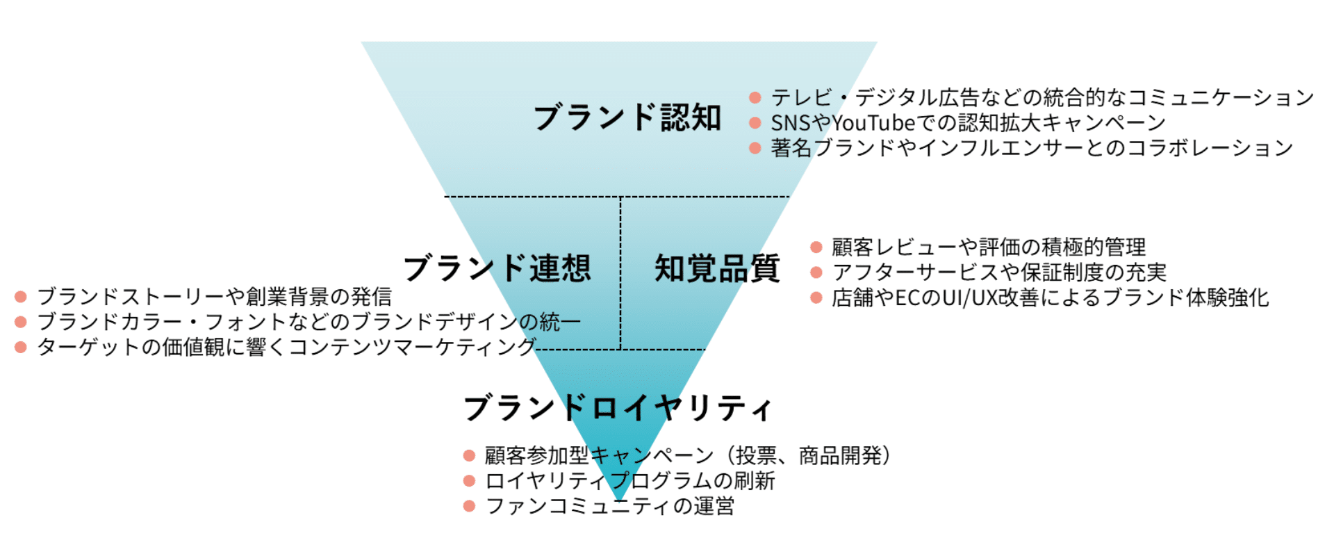 これらは直接的に顧客の認知や印象に関わらない場合もありますが、ブランドの競争力を裏側から支える重要な資産です。