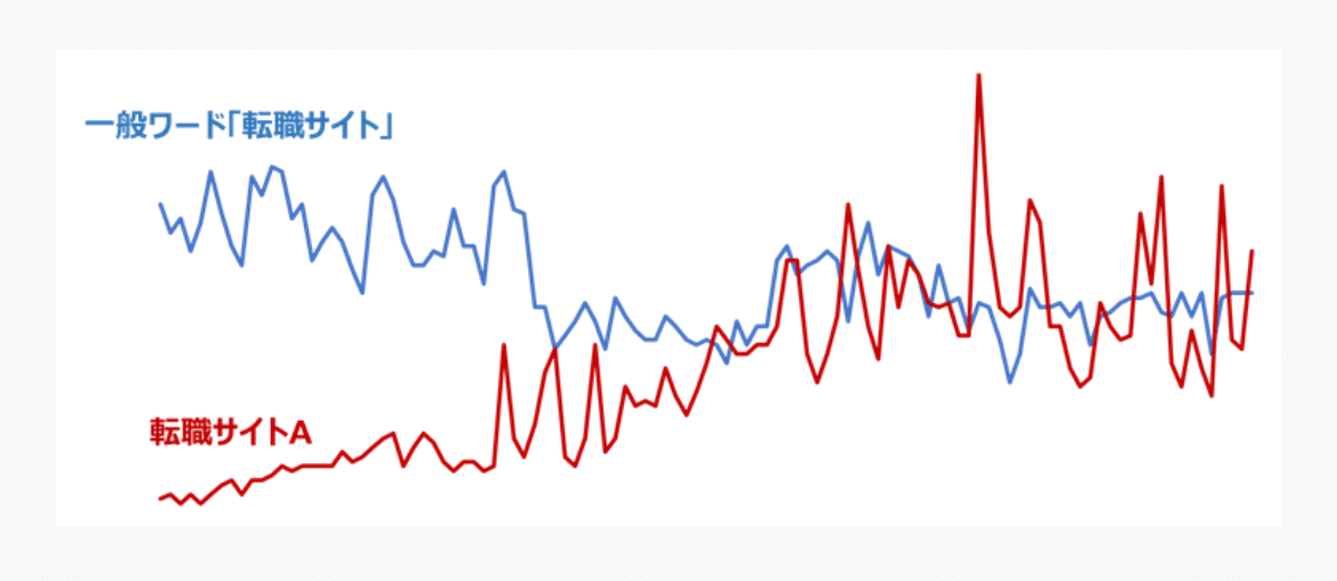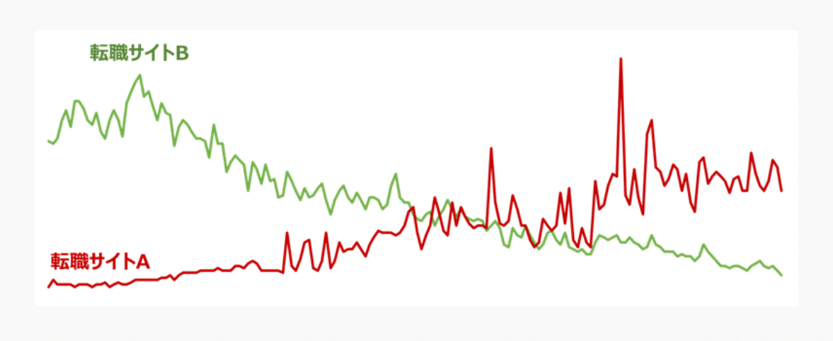 グラフを見ると、ある時期から「転職サイトA(赤)」が「転職サイトB(青)」の指名検索数を上回り始めたことがわかります。