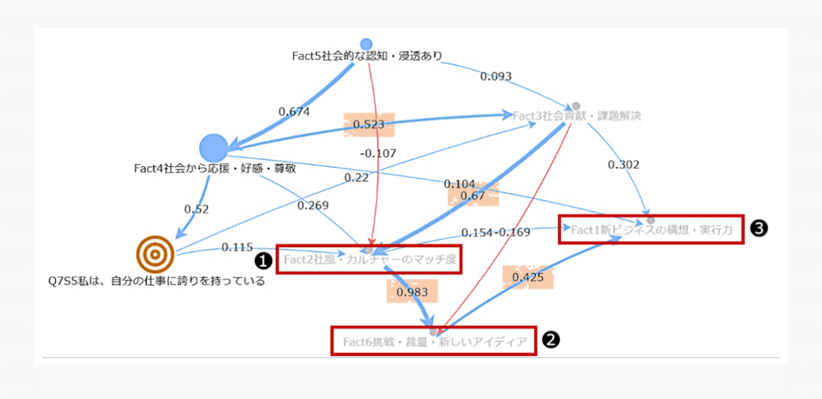 コーザル分析から明らかになったのは、社風マッチ度 → 挑戦機会(0.983) → 新ビジネス構想力(0.425)という、誇りと事業成長をつなぐ強力な連鎖です。