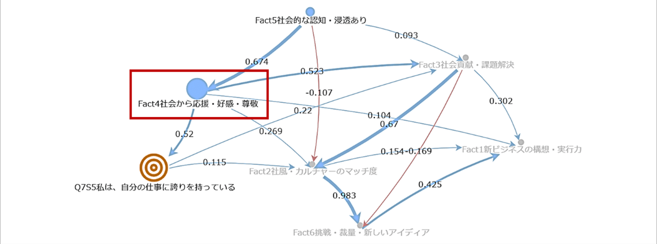 分析結果によると、「社会からの応援・好感・尊敬」は他の要素に比べて誇りへの影響度が際立って高く、直接的なモチベーション向上だけでなく、間接的に組織カルチャーや挑戦意欲、新規事業の創出にも波及することが確認されました。