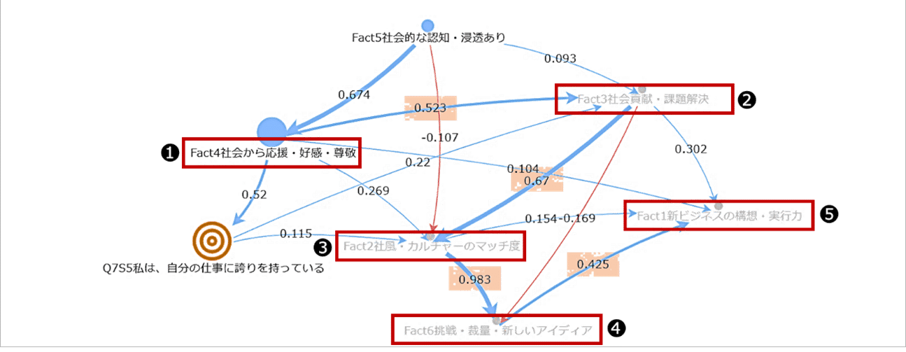 次に、挑戦機会が増えることで新ビジネスの構想・実行力が高まります。この関係も 0.425 と中程度以上の強い因果を持ち、「裁量と自由」を持てる環境こそが、事業の未来を形づくる源泉であることを示しています。