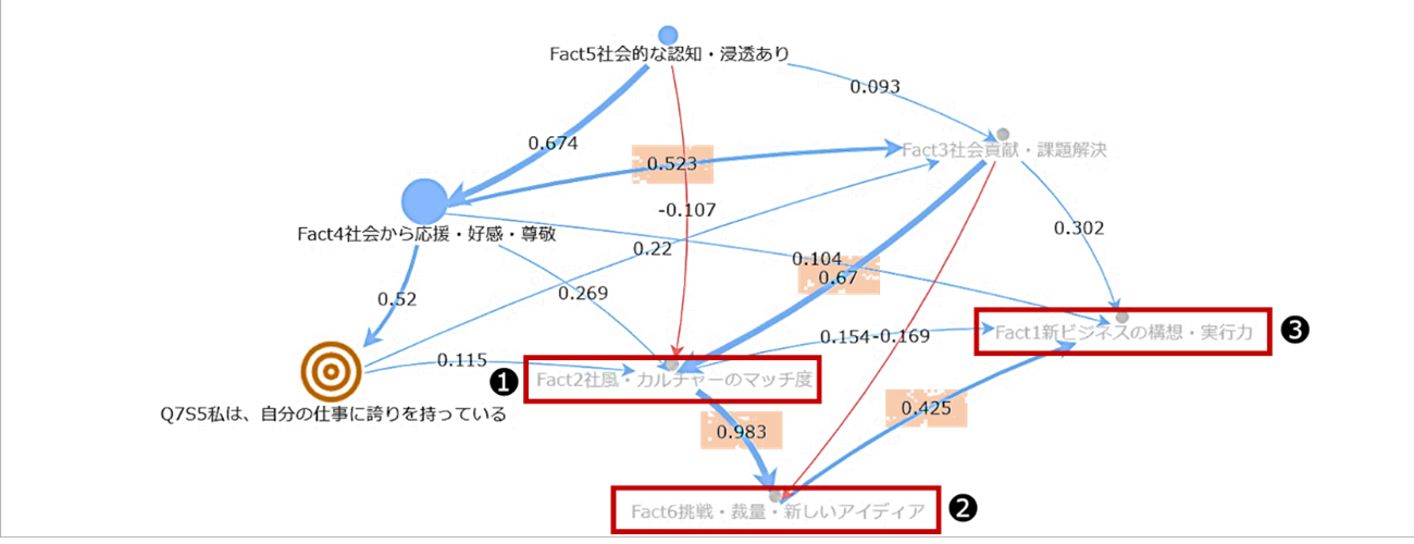 コーザル分析から明らかになったのは、社風マッチ度 → 挑戦機会(0.983) → 新ビジネス構想力(0.425)という、誇りと事業成長をつなぐ強力な連鎖です。