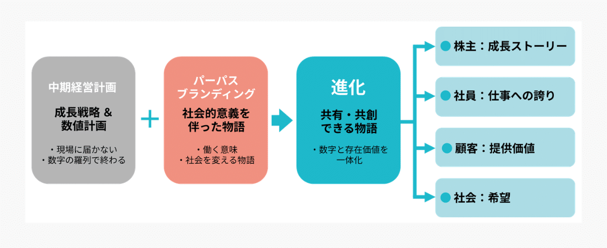 言い換えれば、パーパスブランディングは中期経営計画に “感情移入を宿すプロセス” です。
