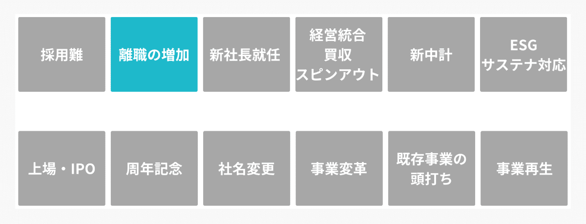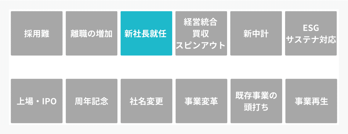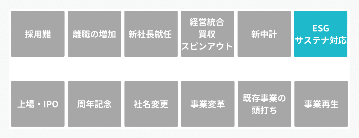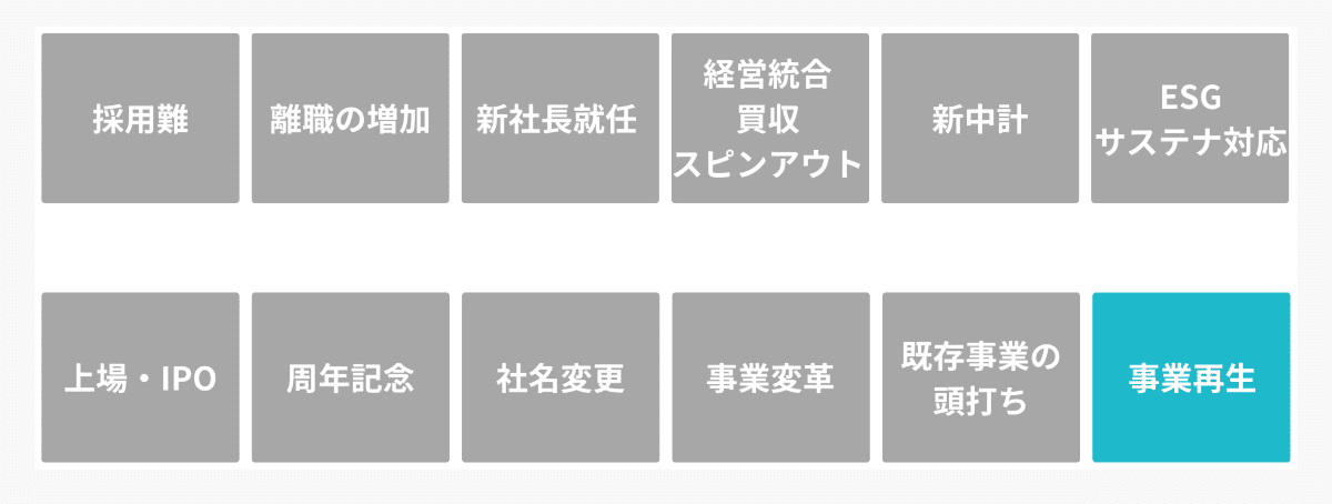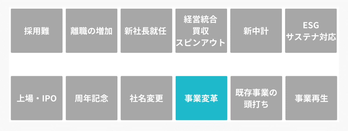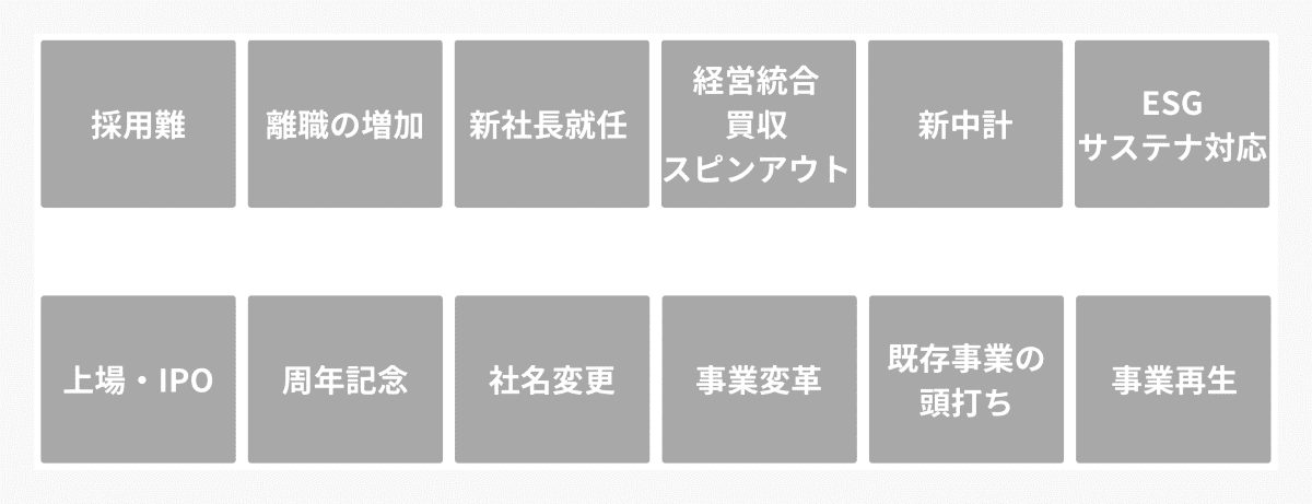 「いまこそ着手すべき根拠」を、企業が直面する 12の転機(採用難、離職増、新社長就任、経営統合、中期経営計画、ESG対応、IPO、周年、社名変更、事業変革、既存事業の頭打ち、事業再生)として明文化します。