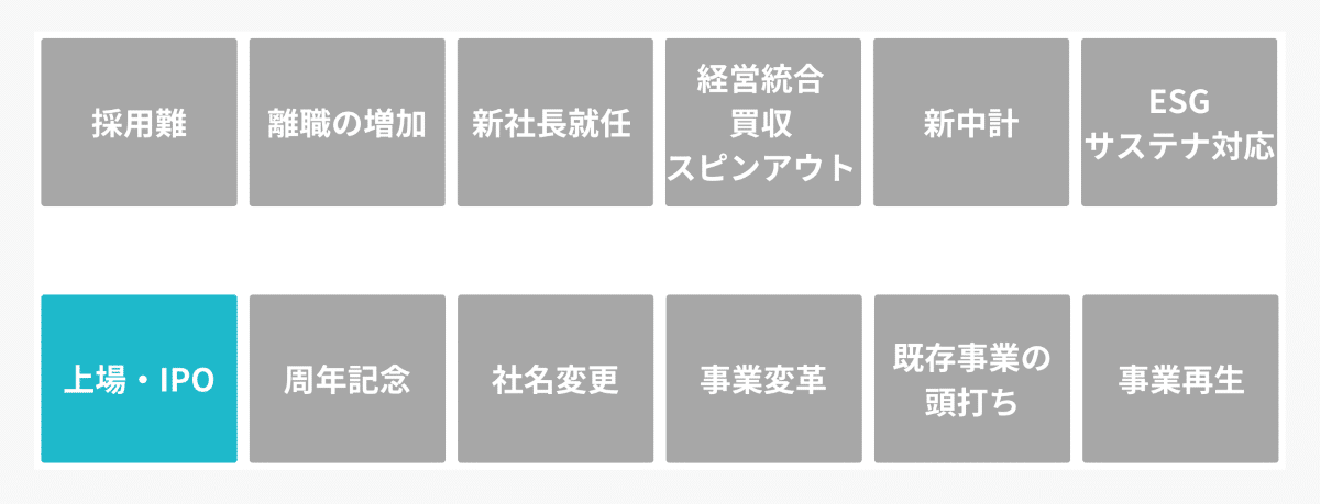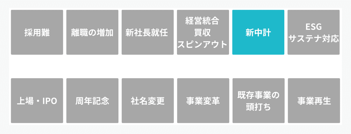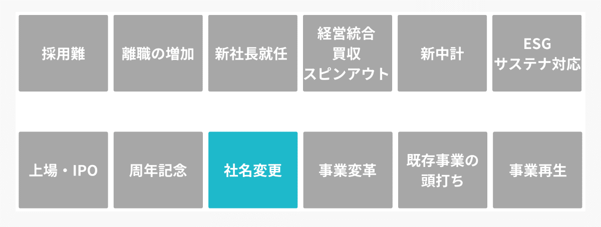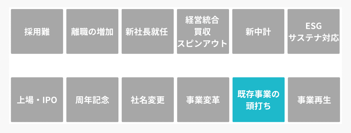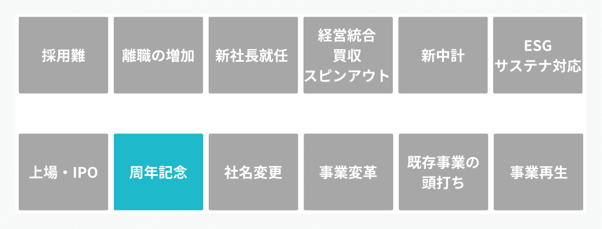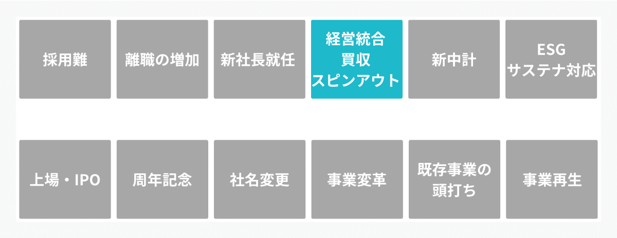 「いまこそ着手すべき根拠」を、企業が直面する 12の転機(採用難、離職増、新社長就任、経営統合、中期経営計画、ESG対応、IPO、周年、社名変更、事業変革、既存事業の頭打ち、事業再生)として明文化します。