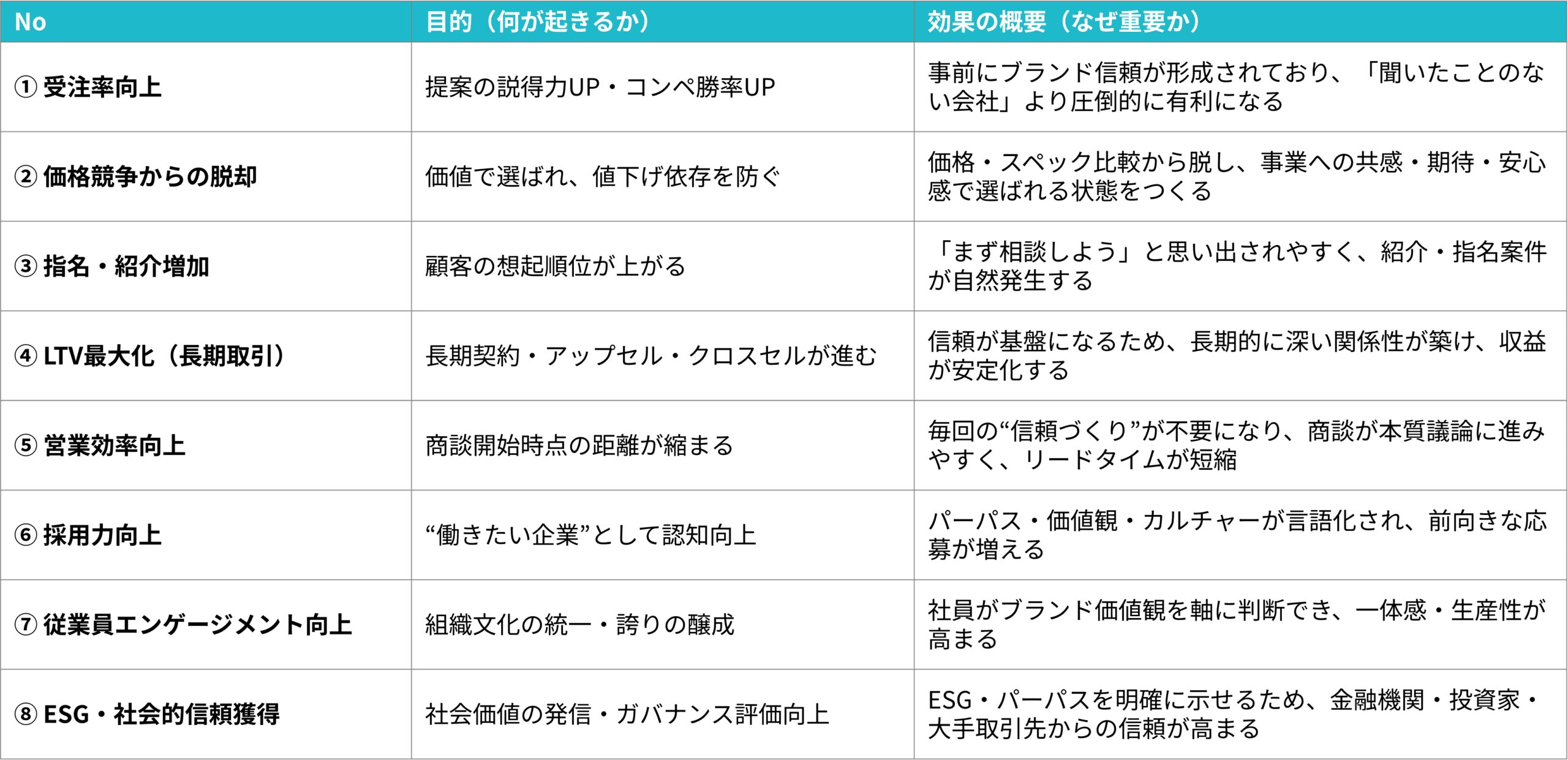 ここでは、BtoBブランディングがもたらす代表的な8つの効果(ゴール)をご紹介していきます。