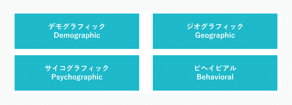 セグメンテーションを設計する際の基本軸となるのが、Geographic(地理)/Demographic(人口動態)/Psychographic(心理)/Behavioral(行動)という “4つの変数” です。
