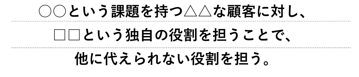 - 例:「○○という課題を持つ△△な顧客に対し、□□という独自の役割を担うことで、他に代えられない役割を担う」
