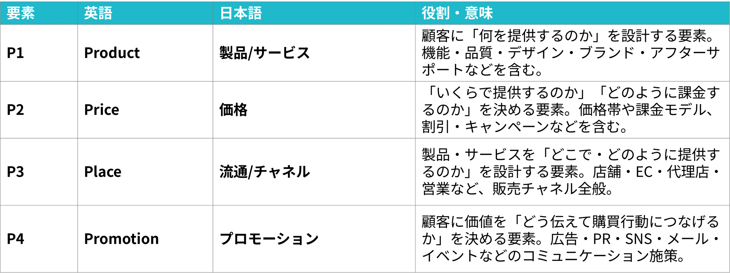この記事では、マーケティングミックスを 「実務で使えるフレーム」 として理解できるように、以下の観点で整理しています。これはBtoCマーケティングでもBtoBマーケティングでも共通です。