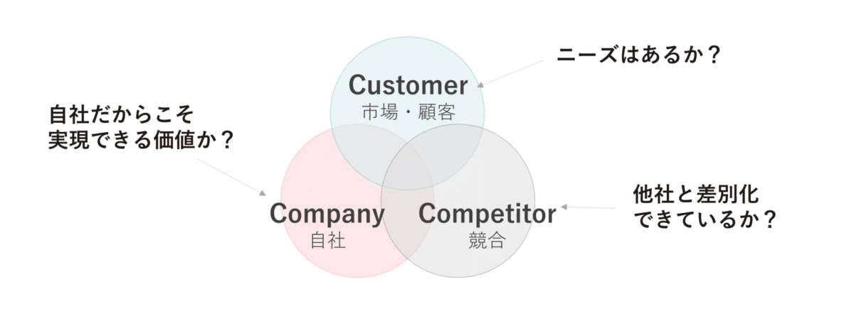 優れたコンセプトを決めるためには、マーケティングの基本原則である「3Cフレームワーク(Customer/Competitor/Company)」の視点を取り入れることが有効です。