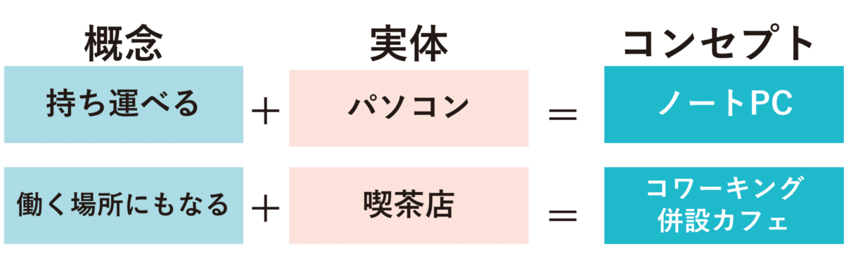 ここで、ぜひ覚えていただきたいのが、コンセプトとは「実体+概念」の組み合わせで作るものであることです。