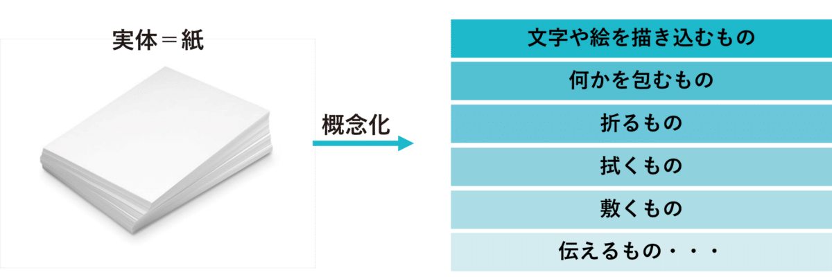 例えば「紙」という実体があったとします。そこから「書き込むもの」「包むもの」「折るもの」といった概念を取り出すことができます。