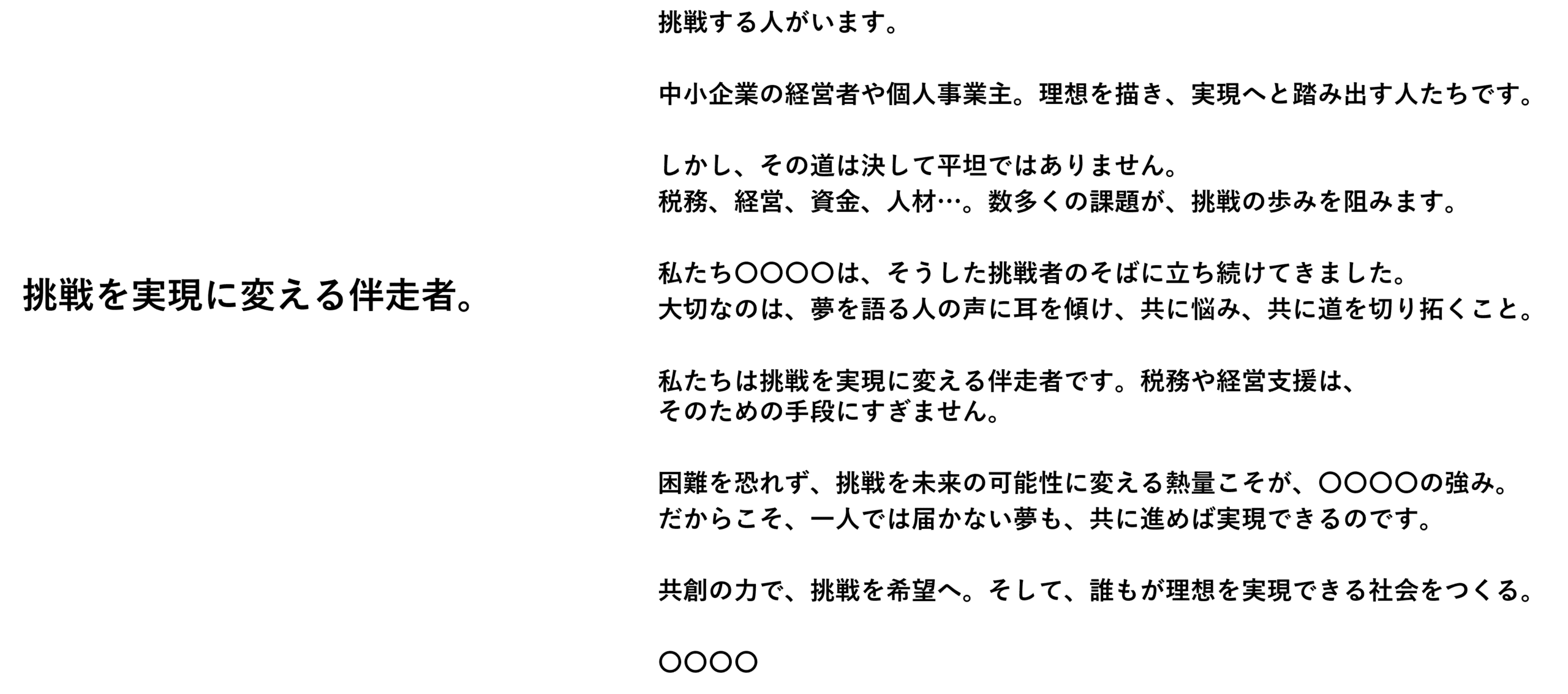 例:「挑戦者を実現に変える伴走者。」「私たちが築いているのは、インフラではなく希望です。」