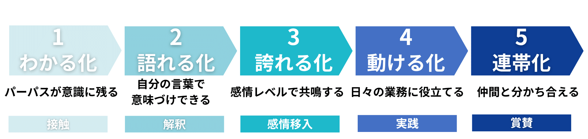 経営者メッセージ動画やパーパスワークショップ、ストーリーテリング研修、パーパスカードや名刺などのツールを組み合わせ、社員が自らの仕事を通してパーパスを“実感・体現”できる環境を整えます。