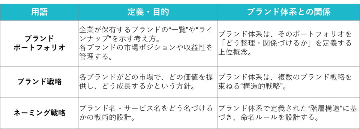 ブランド体系と混同されがちな言葉に、「ブランドポートフォリオ」「ブランド戦略」「ネーミング戦略」があります。これらは密接に関係しますが、目的と適用範囲が異なります。つまり、