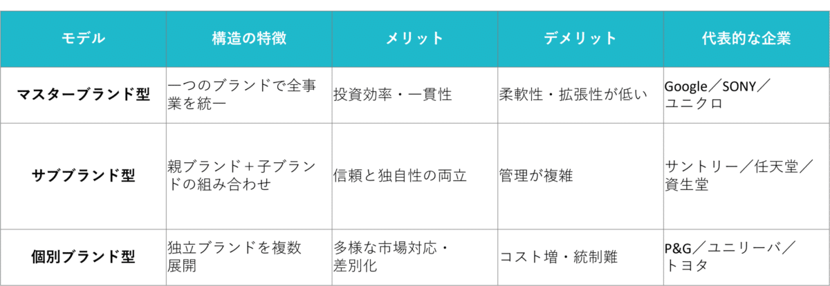 それぞれの特徴と適用シーンを理解することで、自社のブランド群をどう整理すべきかの方向性が見えてきます。