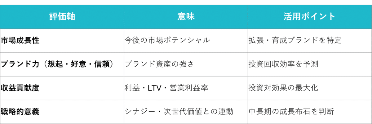 このようにブランドポートフォリオを定量・定性の両面で分析することで、「感覚的に強いブランド」ではなく「経営的に残すべきブランド」を見極めることができます。