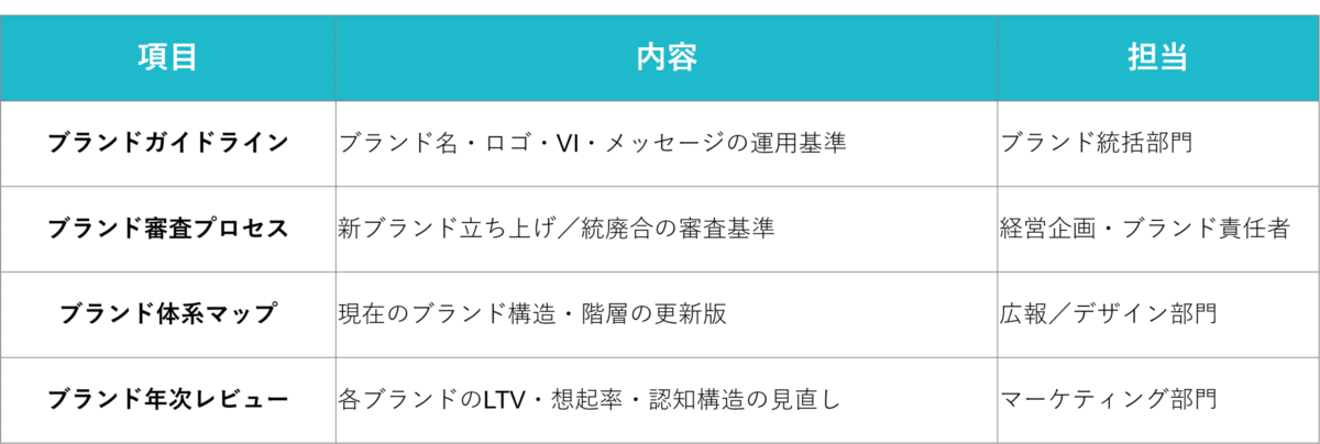 そのために重要なのが、ブランド体系の「運用ルール」と「責任設計」です。