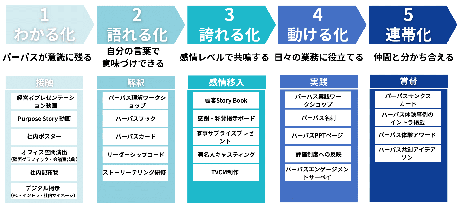 「わかる化 → 語れる化 → 誇れる化 → 役立つ化 → 連帯化」という5ステップで段階的に設計することが効果的です。