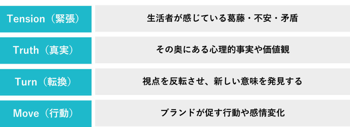 - Tension(葛藤) → Truth(真実) → Turn(価値の転換) → Move(ブランドの行動・打ち手)