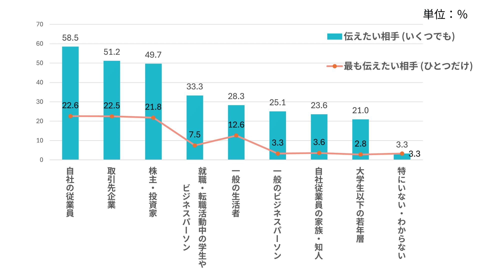 たとえば、「ESG認証を誰に伝えたいか」という設問で、最も多く挙げられたのは「自社の従業員」(58.5%)でした。これは、ESGの取り組みが社内においても重要な意味を持つと、多くの企業で認識されていることを示しています。次いで、取引先企業、株主・投資家、学生・ビジネスパーソンと続きます。