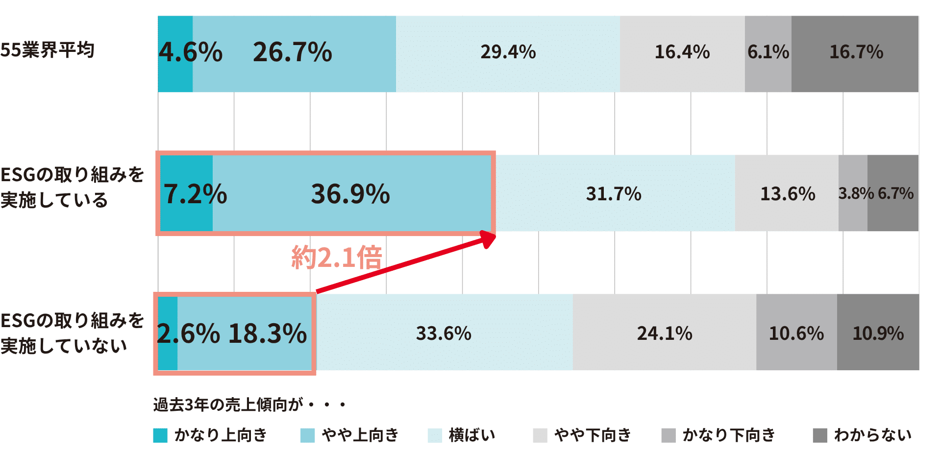 直近3年間の売上データを比較したところ、ESGに取り組む企業の売上高(約1.9倍)、売上総利益率(約2.1倍)、営業利益率(約2.0倍)が大きく上がっていることがわかりました。
