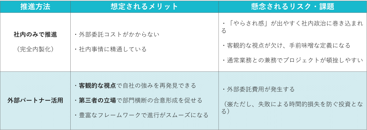 それに対しては、内製化のみで進めた場合の「失敗リスク(やらされ感・形骸化・社内政治による忖度)」を提示することが誠実です。