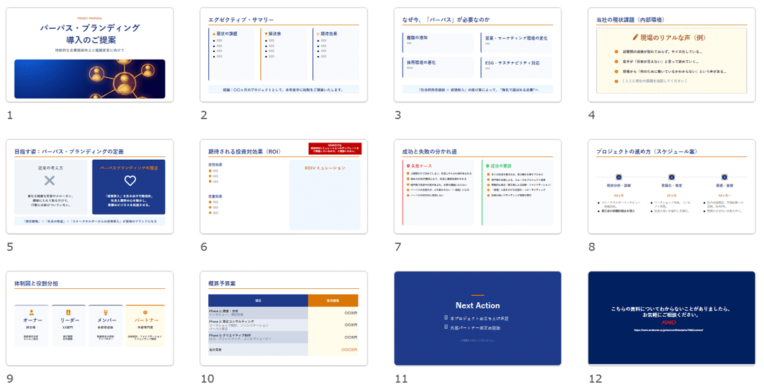 - そのまま使える構成案: エグゼクティブサマリーから課題、解決策、スケジュール、予算案まで、必要なページ構成がすでに完了しています。