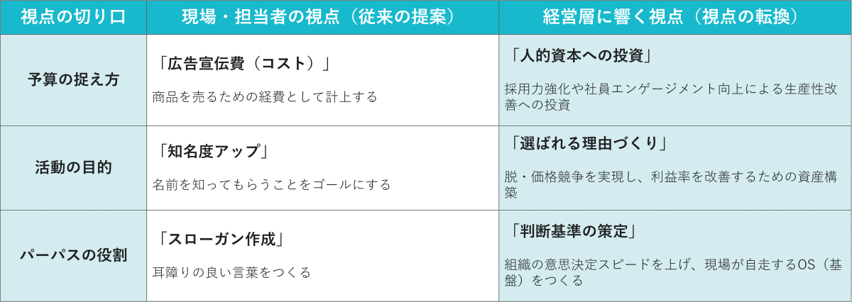 「広告費をください」ではなく、「優秀な人材を採用し、定着させ、組織の生産性を高めるための人的資本投資です」と語ることで、経営上の優先順位は劇的に上がります。