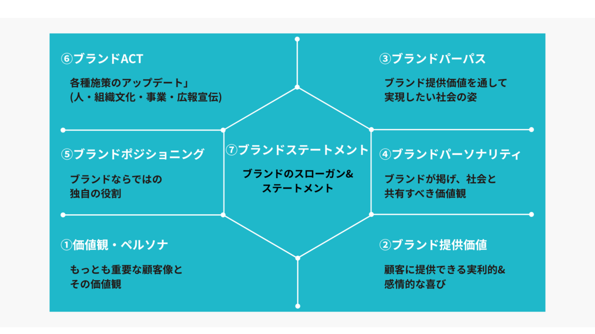 集めた膨大な情報を整理し、ブランドの設計図を描きます。ASAKOでは、以下の要素を「Brand PRISM」という一枚の図に集約します。