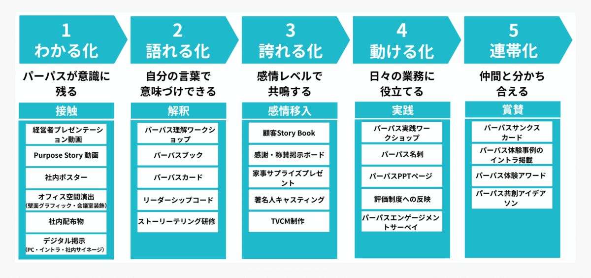 - 部署別ワークショップ:「私たちの部署にとって、このパーパスはどういう意味を持つか?」を話し合い、部署ごとの行動指針(チームパーパス)を作る。