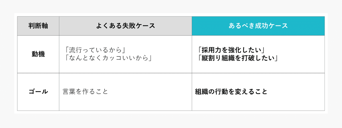 ここが曖昧なまま進むと、後のフェーズで言葉が決まりかけた時に「なんか違う」「やっぱり元に戻そう」といった”ちゃぶ台返し”が発生し、プロジェクトが頓挫する原因になります。