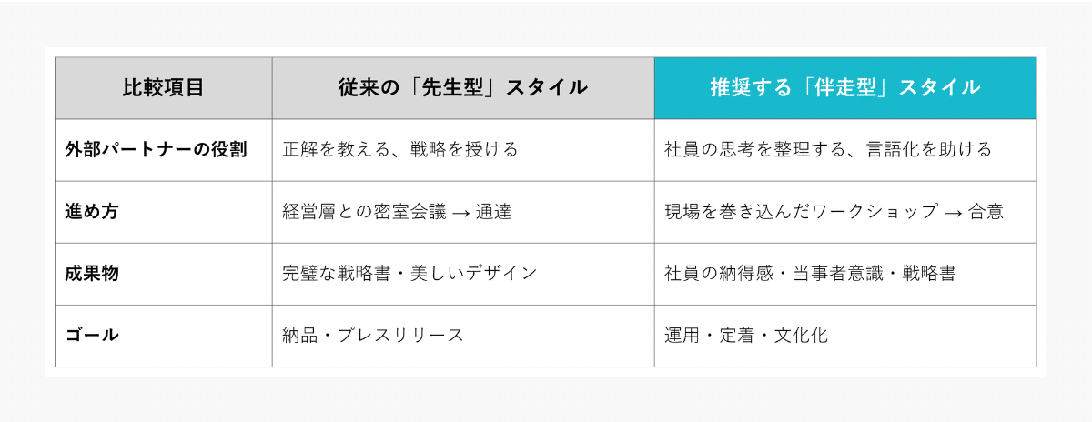 「素晴らしい戦略やロゴの案」だけを持ってくるパートナーは、納品がゴールになりがちです。一方、「どのように社員を巻き込むか」「どうやって合意形成するか」というプロセスまで設計し、提案してくれるパートナーは、運用後の定着まで見据えていると言えます。