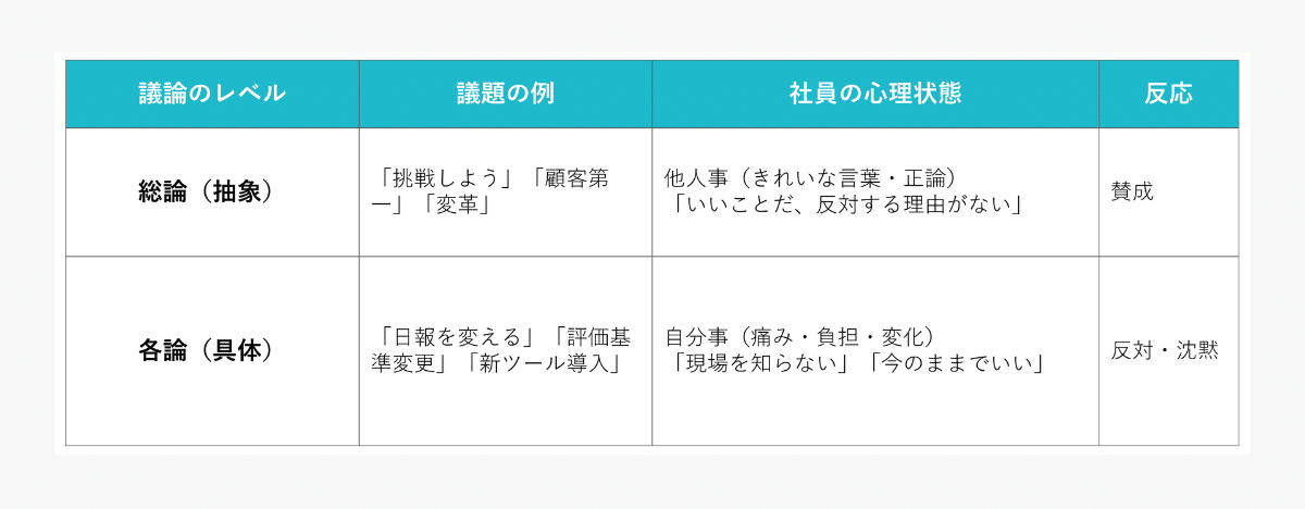 これを私たちは「総論賛成・各論反対」と呼んでいます。以下の表のように、議論の具体度が上がるにつれて、社員の態度は「他人事」から「自分事(痛み)」へと変化し、抵抗が生まれるのです。
