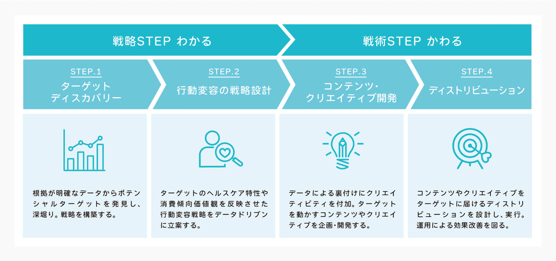 開発コンテンツを多様なチャネルで配信し、PDCAを回しながら改善。また、施策の効果を数値で測定・評価し、その結果をCRM施策にも反映。戦略を実行まで確実に結びつけ、持続的に成果を生み出すヘルスケアマーケティングを実現。