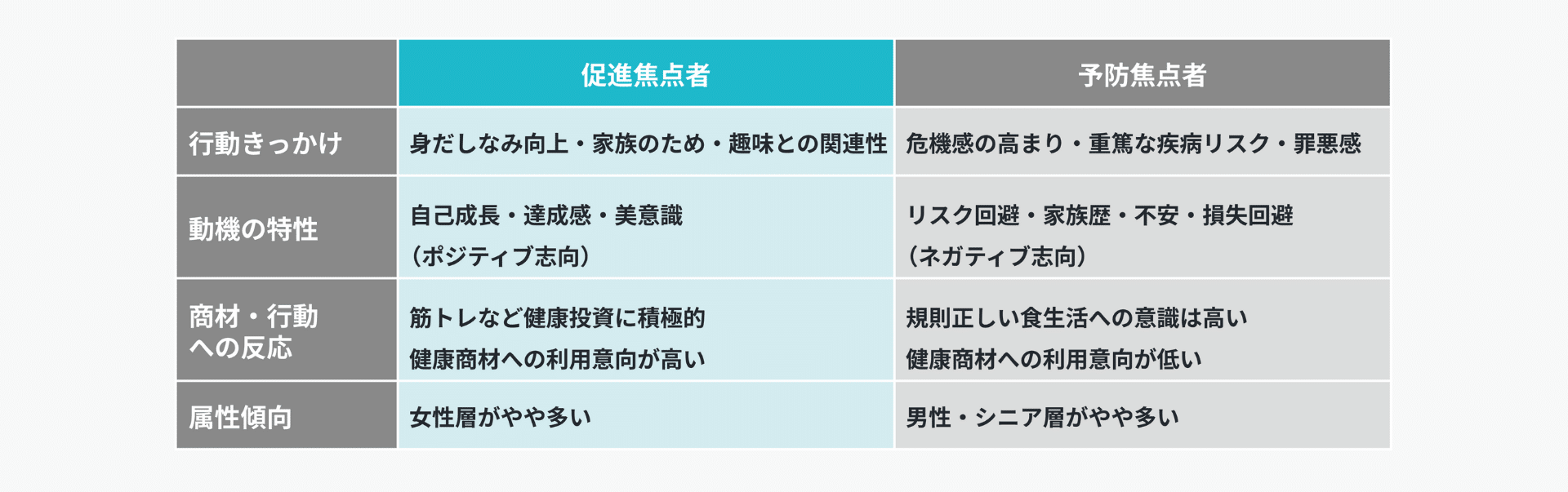 当社では2025年全国20~70代の男女10,000人を対象とした大規模な予防行動調査を実施。本調査では人の健康行動への動機付けメカニズムを解明するため、「制御焦点理論(Higgins, 1997)」を活用しています。行動動機を利得追求の「促進焦点」と、損失回避の「予防焦点」という2つの独立した制御システムで説明する理論です。この知見により、ターゲットの心理的動機に基づいた精緻なマーケティング戦略の策定が可能となります。